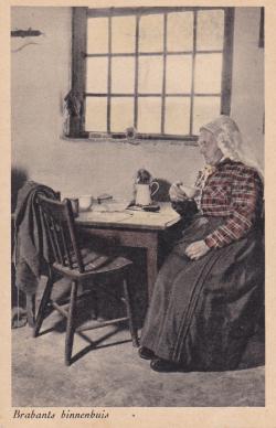 Den herd was verder ingericht met een tafel, met daar rond omheen de bekende Brabantse knopstoelen, en een grote kast, het kabinet. Op dat kabinet stonden stolpflessen met daarin de heiligenbeelden van het gezin. Op bovenstaande prentbriefkaart zie je boven het kastje ook nog foto’s en religieuze schilderijen hangen.