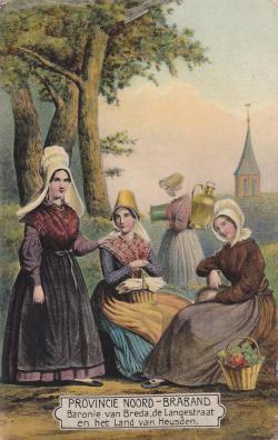 * Noord-Brabant (boerin met poffer en sieraden) (W. de Haan, Utrecht, serie OB 12 dessins. Chromotypie Morks en Geuze, Dordrecht) (kaart in blauw)