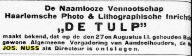 Aan deze vennootschap komt medio 1908 een einde, waarna Joop alleen verder gaat onder de naam Jos. Nuss & Co, tot de N.V. werd opgericht. In oktober van dat jaar wordt de N.V. Haarlemsche Foto- en Lithografische Inrichting "De Tulp" opgericht, die de activiteiten voortzet en waarbinnen Joop behalve een baan één aandeeltje heeft. Hij krijgt dan een directeur boven zich.
