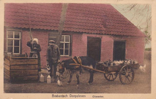 Op het Brabantse land werden allerlei dieren voor de kar gespannen. Natuurlijk waren dat paarden, maar vaak ook koeien of ossen. Ook een hond of een schaap met daarachter een volgeladen kar kwam voor. En natuurlijk ook de ezel, al zien we die niet zo vaak op een prentbriefkaart afgedrukt. Misschien sprak zo’n ezel toch minder tot de verbeelding dan de rest van de beestenboel.